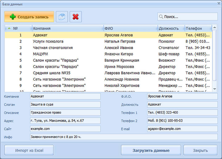 У программы есть встроенная база данных компаний и сотрудников. Это резко ускоряет повторную подготовку визиток в едином стиле, когда нужно делать карточки не для одного человека, а для целого штата. Данные можно сохранять, искать, загружать в любой шаблон, а также импортировать из Excel и CSV.