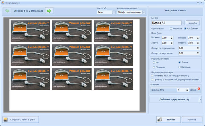 Программа умеет раскладывать карточки на листе, задавать поля, отступы, количество копий, маркеры обрезки, ориентацию бумаги и разрешение печати. Это снимает с пользователя отдельную головную боль по подготовке листа к домашней печати или к контрольному просмотру перед типографией.