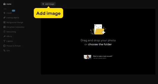 После загрузки слева активируются разделы обработки (коррекция, ретушь, удаление объектов, замена фона и т. д.).