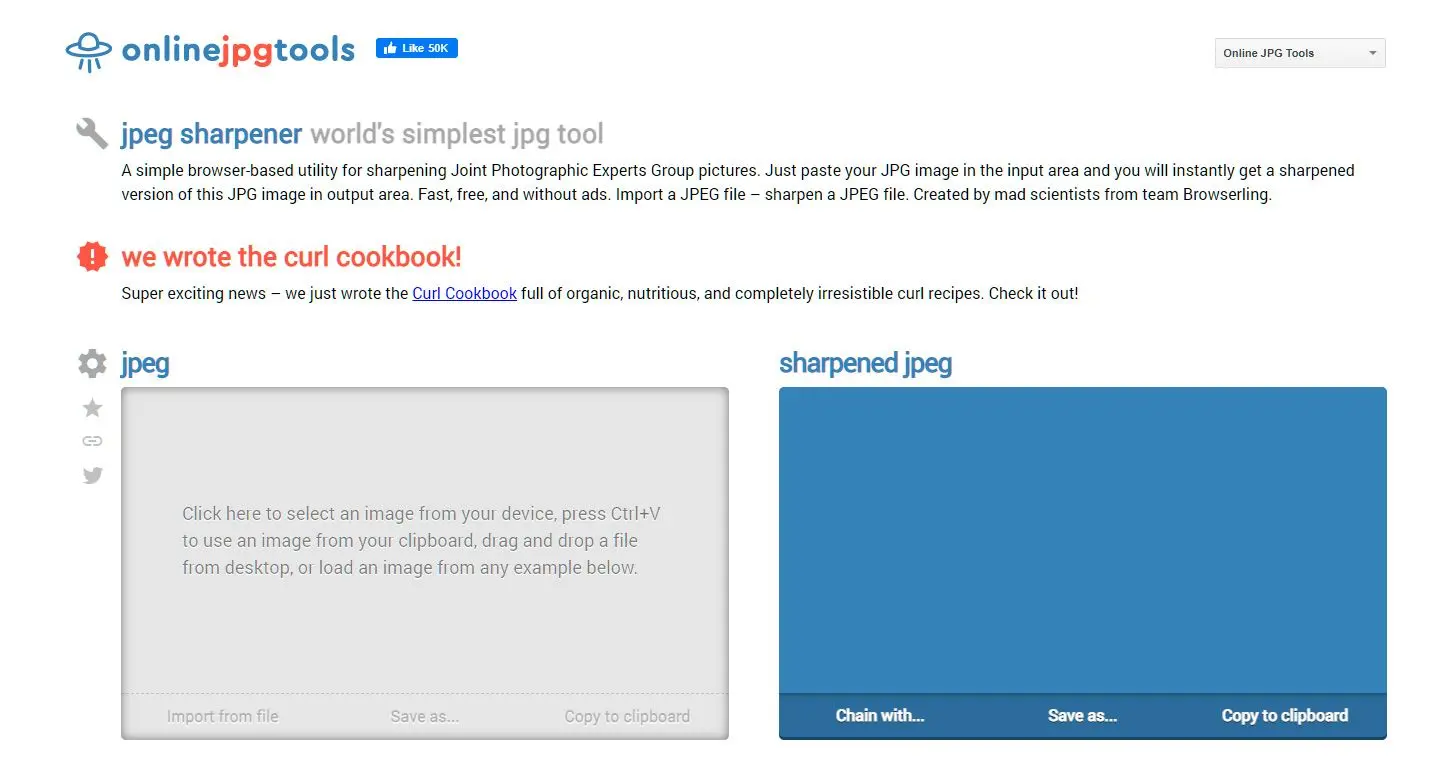 У сервиса хорошо читаемая структура. На сайте есть верхняя навигация с разделами All Tools, Features, Pricing, About Us, а каждая отдельная утилита оформлена по одной схеме: заголовок инструмента, ссылки Use This Tool, See Examples, Learn How to Use, блок загрузки исходного файла, область результата, панель параметров и примеры ниже по странице. Внутри самих инструментов пользователь видит знакомые действия: Click to load an image, Or drop an image here, Or paste it here (ctrl+v), Or load from examples (below), а затем команды Save as..., Copy to clipboard, Download, Export to Pastebin. Это делает onlineJPGtools очень последовательным: освоив один модуль, легко работать и с остальными.