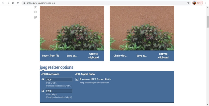 Сначала открывается Resize a JPG/JPEG Picture. Затем в левую часть окна загружается файл через Import from file или обычный клик по области импорта. После загрузки пользователь видит текущие значения размеров и может задать новые значения width и height. Если важно сохранить естественные пропорции, оставляется активной опция Preserve JPEG Aspect Ratio. После этого сервис моментально показывает новую версию справа, и остается только сохранить результат.