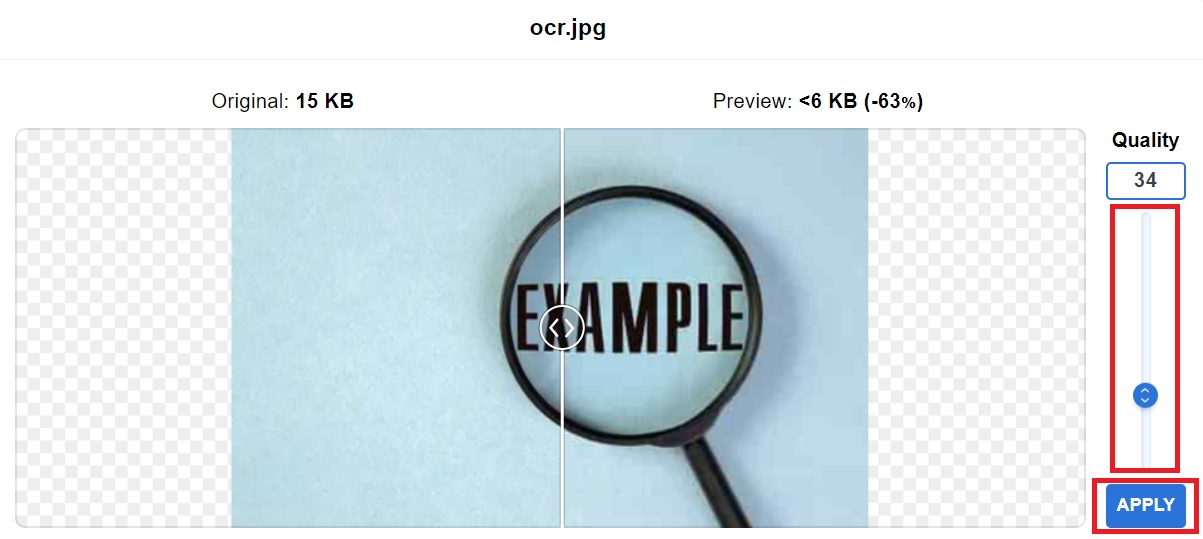 После того как изображение появилось в очереди, по нему можно кликнуть и перейти в рабочую область сравнения. Здесь Optimizilla показывает исходный размер, размер превью после сжатия и процент экономии. Справа располагается вертикальный регулятор Quality, а внизу — кнопка APPLY. Это один из самых важных экранов сервиса, потому что именно здесь происходит реальная ручная оптимизация картинки.