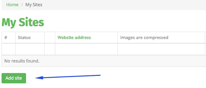 Ниже — скриншот раздела My Sites, где начинается добавление нового проекта в систему. Это один из самых показательных моментов интерфейса: OptiPic строит работу не вокруг абстрактных настроек, а вокруг конкретных сайтов, которые затем обслуживаются в автоматическом режиме.
