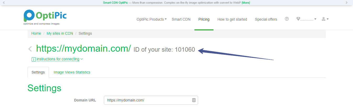 На следующем этапе сервис показывает ID сайта. Именно этот идентификатор потом используется в модуле CMS как главная точка привязки проекта к OptiPic CDN.
