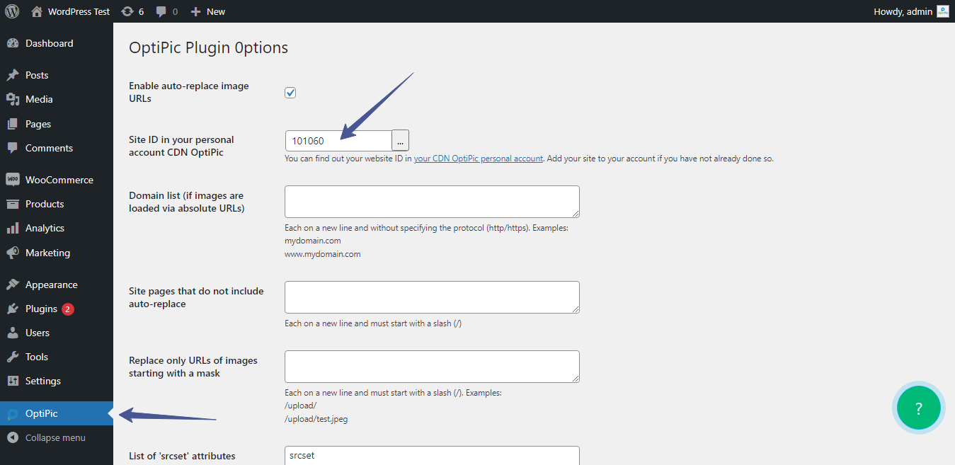Для WordPress пример выглядит именно так: на странице настроек модуля есть блок OptiPic Plugin Options, где среди основных параметров сразу видно Enable auto-replace image URLs, поле Site ID in your personal account CDN OptiPic, Domain list if images are loaded via absolute URLs, Site pages that do not include auto-replace, Replace only URLs of images starting with a mask, List of srcset attributes. Это важный момент: OptiPic не прячет рабочие настройки слишком глубоко и не заставляет лазить по нескольким экранам ради базовой конфигурации.