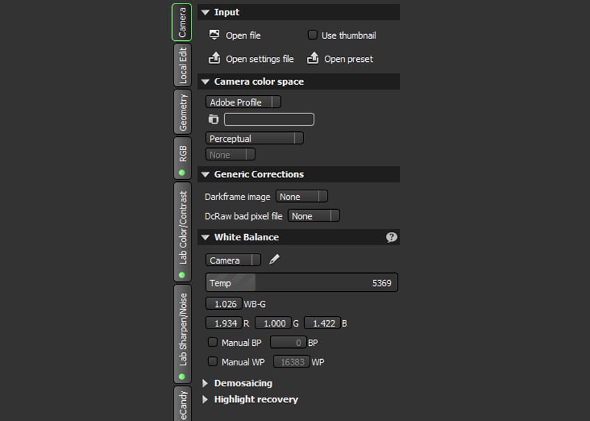 Раздел Camera — один из самых важных во всем Photivo. Всё, что меняется здесь, влияет на изображение еще до поздних стадий обработки. Внутри находятся Input, Camera color space, Generic Corrections, White Balance, Demosaicing, Highlight recovery. Именно этот набор делает Photivo настоящим RAW-конвертером, а не просто редактором уже проявленного изображения.