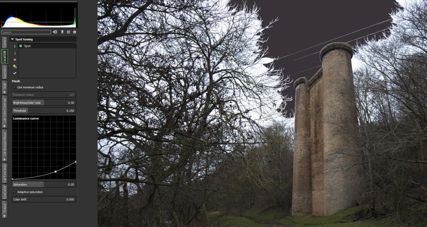 Практически это работает так: если нужно отдельно затемнить небо, приглушить слишком яркую листву, ослабить насыщенность кожи или слегка поменять цветовой сдвиг конкретной зоны, не обязательно уводить всё изображение в нужную сторону. В Local Edit можно создать точку, посмотреть ее влияние через маску, подвигать Luminance curve, скорректировать Saturation и Color shift. В Photivo локальная коррекция выглядит менее глянцево, чем в современных редакторах, но по сути она мощная и очень полезная.