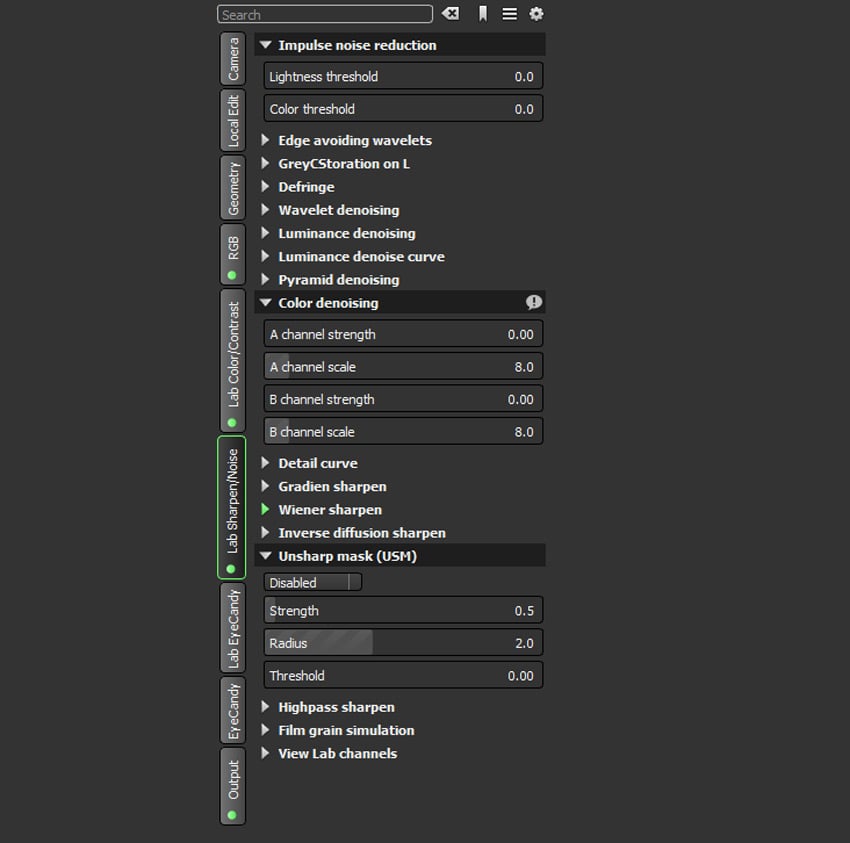 Раздел Lab Sharpen/Noise — это настоящая лаборатория детализации. Здесь доступны Impulse noise reduction, Edge avoiding wavelets, GreyCStoration on L, Defringe, Wavelet denoising, Luminance denoising, Luminance denoise curve, Pyramid denoising, Color denoising, Detail curve, Gradient sharpen, Wiener sharpen, Inverse diffusion sharpen, Unsharp mask (USM), Highpass sharpen, Film grain simulation, View Lab channels. Для программы такого класса это очень богатый набор.