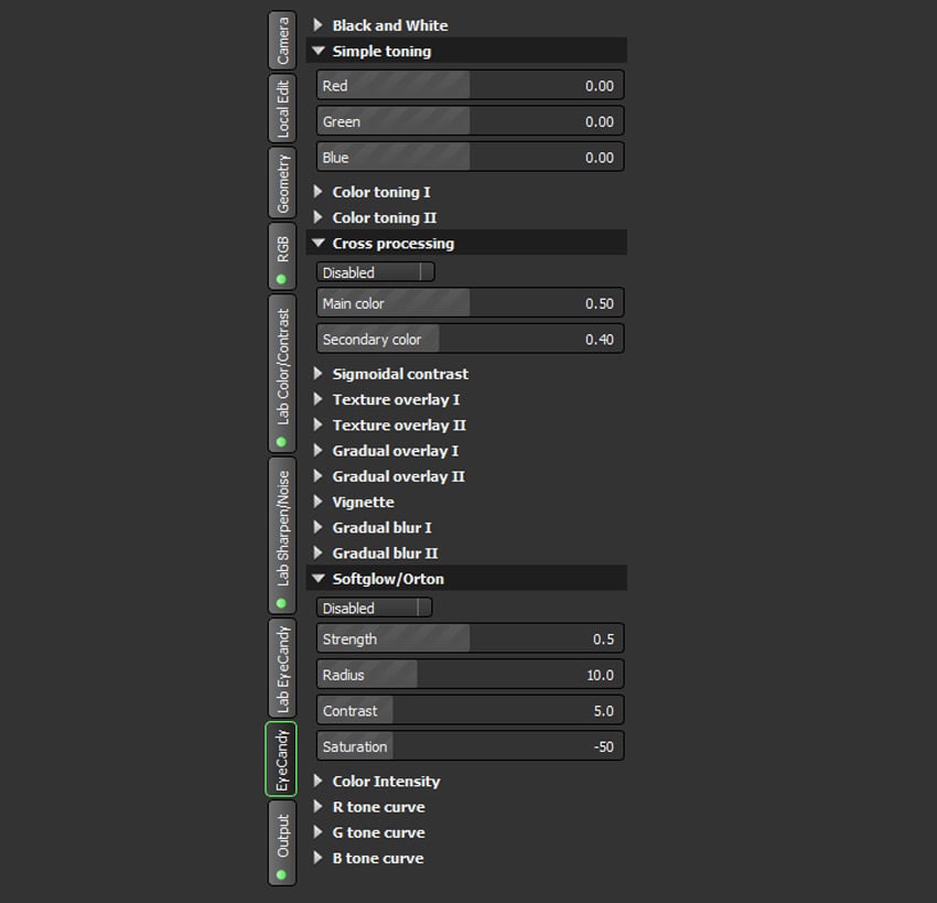 Photivo интересен тем, что художественные блоки не выглядят случайным довеском. Lab EyeCandy и EyeCandy встроены в конвейер обработки и продолжают логику программы: здесь тоже много ручного контроля, а не только список быстрых эффектов. В EyeCandy доступны Black and White, Simple toning, Color toning I, Color toning II, Cross processing, Sigmoidal contrast, Texture overlay I, Texture overlay II, Gradual overlay I, Gradual overlay II, Vignette, Gradual Blur I, Gradual Blur II, Softglow/Orton, Color Intensity, R tone curve, G tone curve, B tone curve.