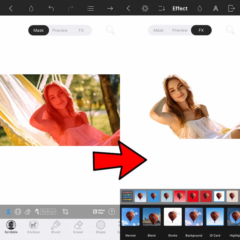 Нижняя панель инструментов и переключатели режимов в реальных экранах приложения показывают характерную логику работы: сначала создается маска, потом можно посмотреть результат без фона, затем применить FX, фон, stroke, blend или ID Card-сценарий. На одном из экранов приложения видны режимы Mask, Preview, FX, а внизу — инструменты Scribble, Enclose, Brush, Eraser, Shape и кнопка Refine Edge. Это не декоративные элементы: именно они определяют, насколько аккуратной получится вырезка на сложном контуре.