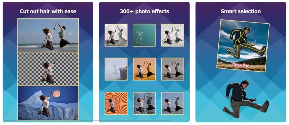 Приложение включает более 40 filters и свыше 300 predefined effects: shadow, highlight, outline, modern art, cartoon, blur, glass, pencil, comic book, mosaic и другие. Плюс заявлен 21 image compositing mode. Это превращает программу не просто в cut out editor, а в легкий редактор для стилизации вырезанного объекта и сборки композиции с разным характером наложения.