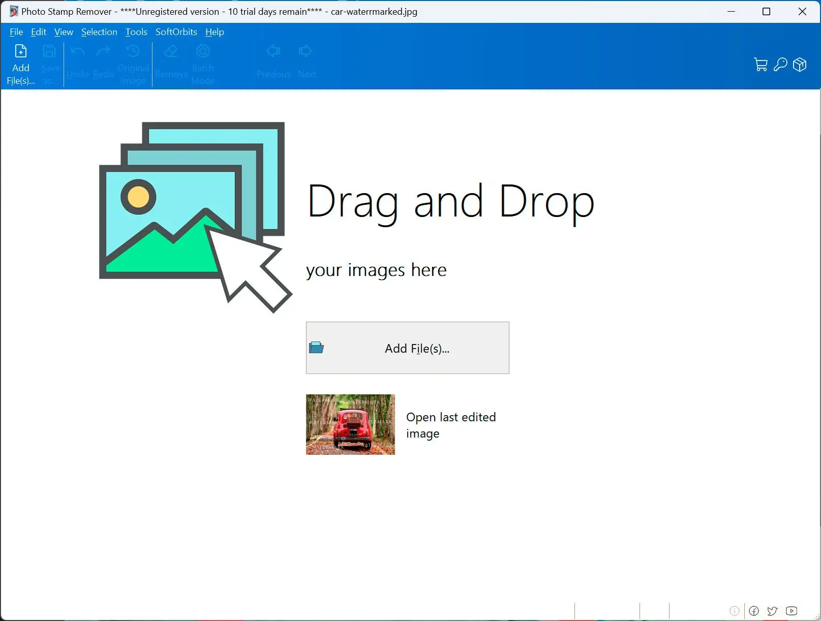 Стартовый экран тоже сделан в прикладном стиле. Здесь нет ничего лишнего: крупная область Drag and Drop your images here, кнопка Add File(s)... и быстрый доступ к последнему отредактированному изображению. Для человека, который раньше не пользовался такими утилитами, это большой плюс. Photo Stamp Remover не тратит время пользователя на декоративный интерфейс и сразу приглашает к действию: загрузить картинку и начать обработку. В обзоре программы это нужно отметить отдельно, потому что именно из-за такого входа она воспринимается как понятный рабочий инструмент, а не как переусложненный редактор.