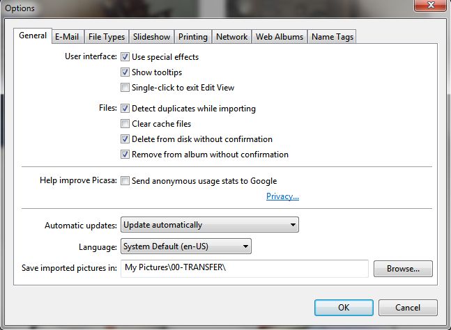 Основные параметры Picasa сосредоточены в окне Options, которое открывается через Tools → Options. Вкладки и названия в нём максимально практичные: General, E-Mail, File Types, Slideshow, Printing, Network, Web Albums, Name Tags — то есть всё, что касается импорта, отображения, типов файлов, слайд-шоу, печати и распознавания имён и лиц.