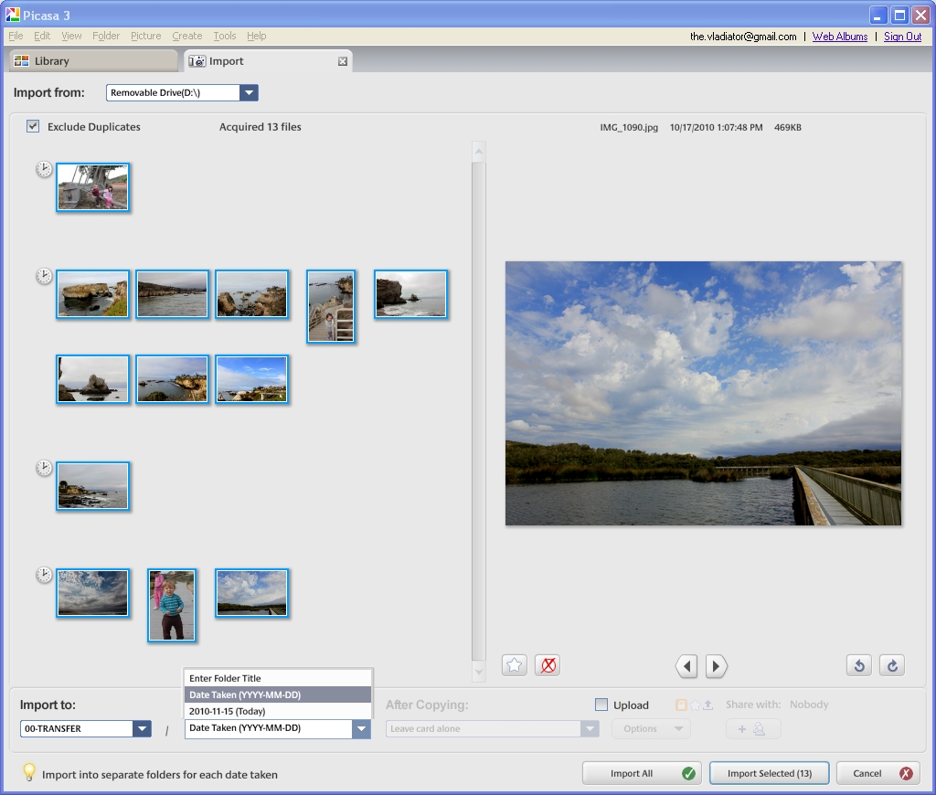 Вот как выглядит типичный импорт-экран Picasa 3: слева миниатюры на импорт, справа крупный предпросмотр, снизу — настройки, куда и как складывать файлы.