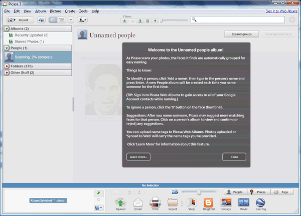 В Picasa есть режим People, который группирует снимки по лицам и позволяет назначать имена (Name Tags). Типичный сценарий: семейный архив, события, съёмки с людьми — вы один раз подписываете лица, а потом находите нужного человека в пару кликов.