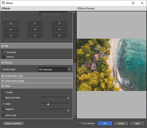 Кнопка Effects... — один из самых полезных элементов интерфейса. Именно здесь Pixillion выходит за рамки простого конвертера и превращается в инструмент массовой подготовки изображений. Через Effects можно менять размер, поворачивать изображение, отражать его, добавлять текстовый водяной знак, вставлять watermark image, применять фильтры и настраивать визуальные параметры итогового файла. При этом все изменения применяются в рамках потока обработки, то есть не требуют отдельного сохранения промежуточной версии.