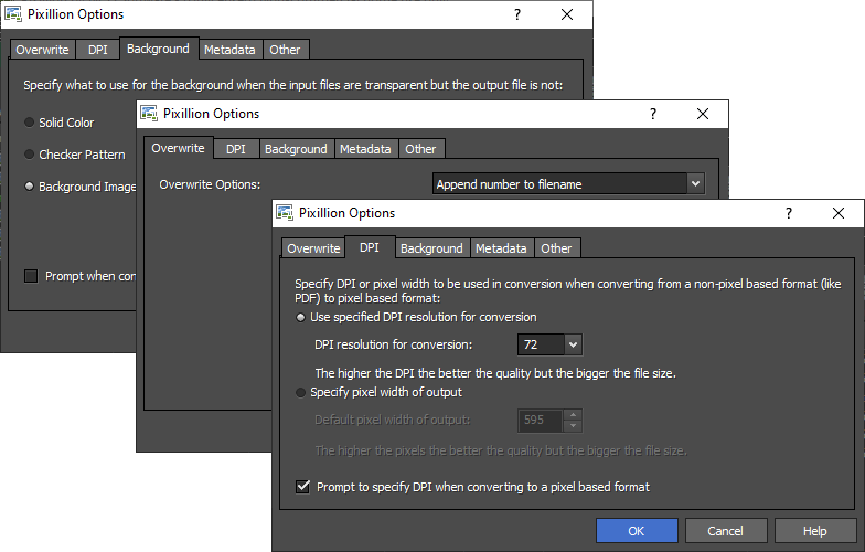 Отдельный интерес представляет окно Options, где собраны параметры, влияющие на поведение программы и сохранение файлов. В частности, там есть вкладки, связанные с Overwrite, DPI, Background, Metadata и Other. Это не те параметры, с которыми сталкиваются каждую минуту, но они важны, когда проект требует более аккуратной настройки логики перезаписи, DPI при конвертации в pixel-based форматы, обработки фона и метаданных.