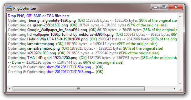 Программа автоматически определяет, что именно нужно сделать: оптимизировать PNG или конвертировать BMP, GIF, TGA в PNG.