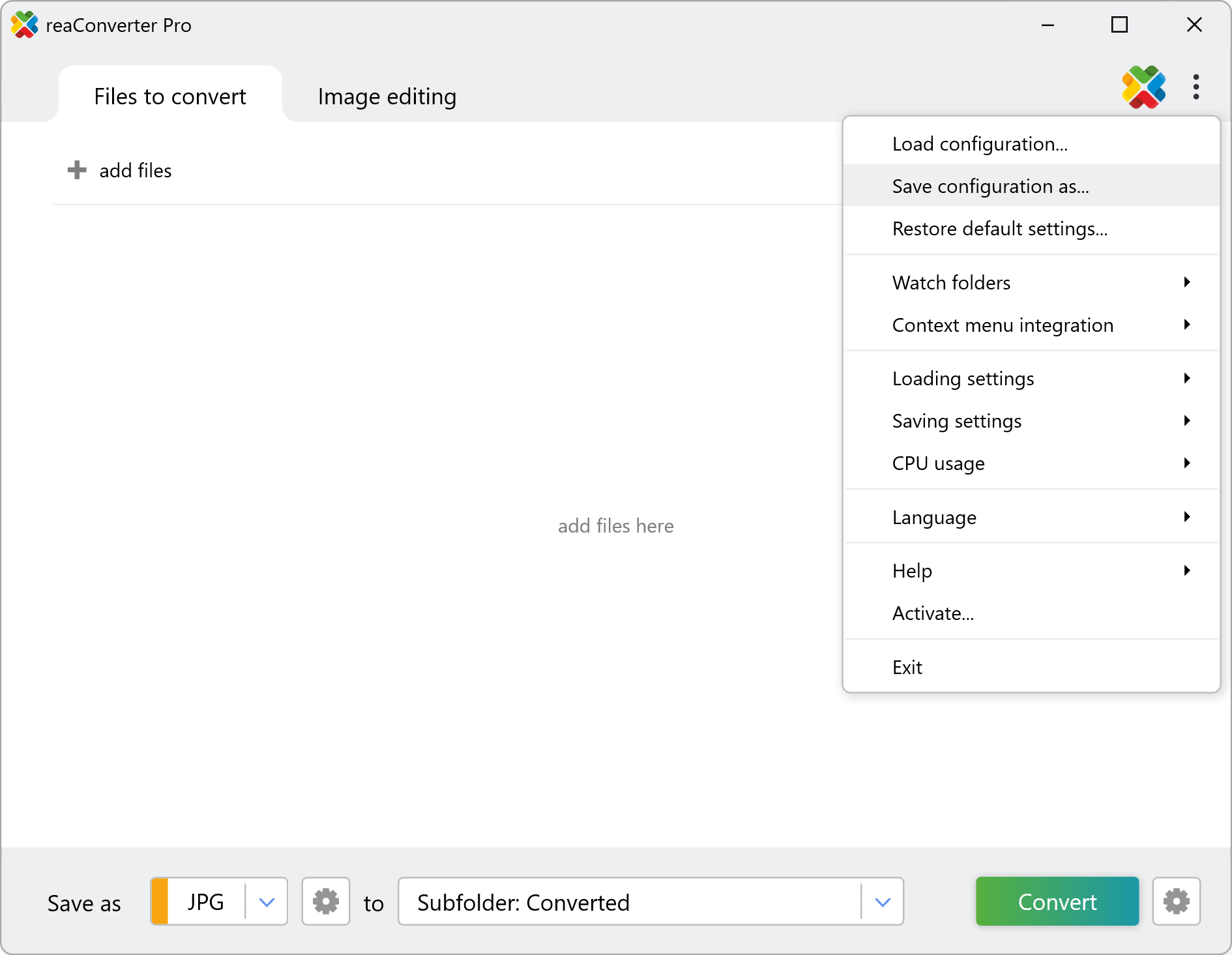 Интерфейс reaConverter построен вокруг двух основных вкладок: Files to convert и Image editing. В верхней части находится список исходных файлов, слева — кнопка + add files, внизу — ключевая рабочая панель с выбором формата через блок Save as, настройкой формата через иконку-шестеренку, выбором папки назначения и кнопкой Convert. Справа сверху вынесена кнопка Menu, из которой открываются настройки, автоматизация, загрузка и сохранение конфигураций и служебные параметры. Такая схема делает программу понятной с первого запуска: отдельная вкладка отвечает за то, что обрабатывать, а отдельная — как именно изменять содержимое файла перед сохранением.