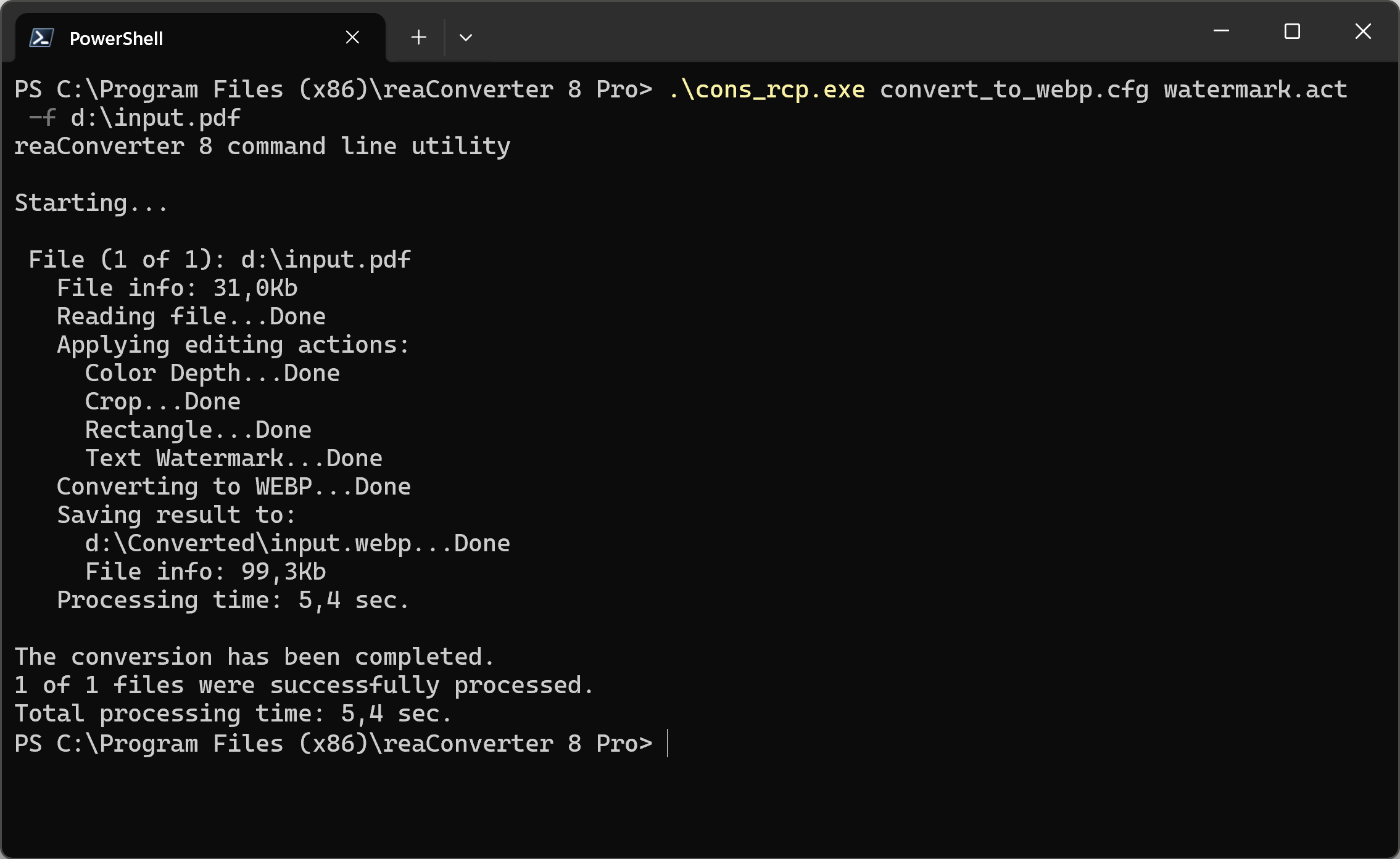 reaConverter Pro включает консольный инструмент cons_rcp.exe, который находится в папке установки. Через него доступны и конвертация, и editing actions, и вызов .cfg/.act, и пакетная обработка папок, и запись логов, и тихий запуск. Поддерживаются как прямые параметры командной строки, так и использование заранее подготовленных конфигураций.
