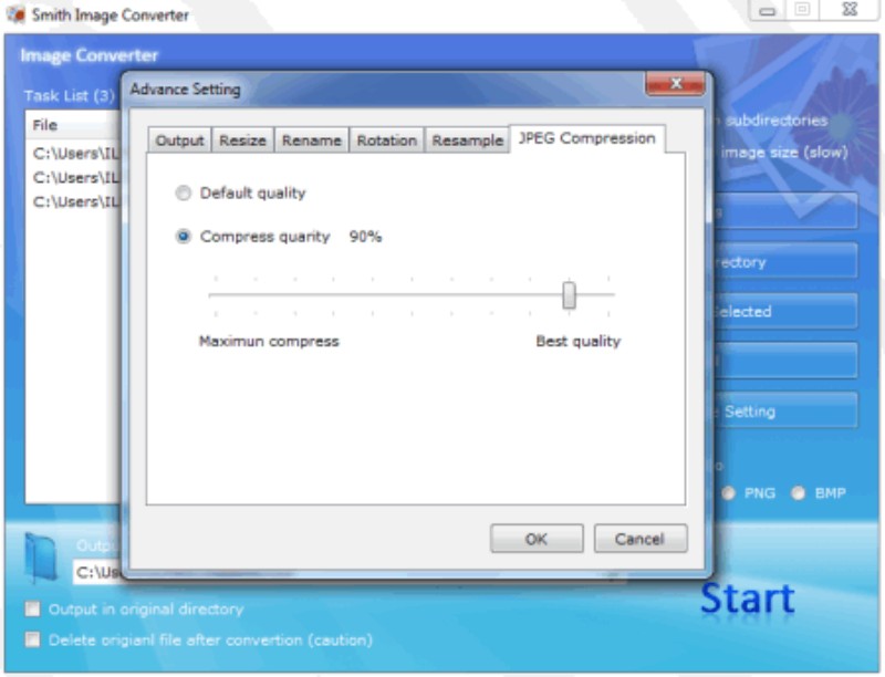 Advance Setting — открыть окно расширенных настроек (resizing/rename/rotation/resample/JPEG compression и связанные параметры).