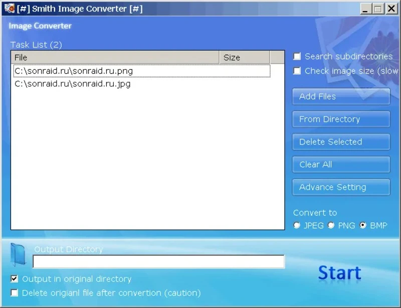 Поскольку Smith Image Converter работает с тремя форматами, выбор в блоке Convert to всегда означает во что будут преобразованы все файлы партии.