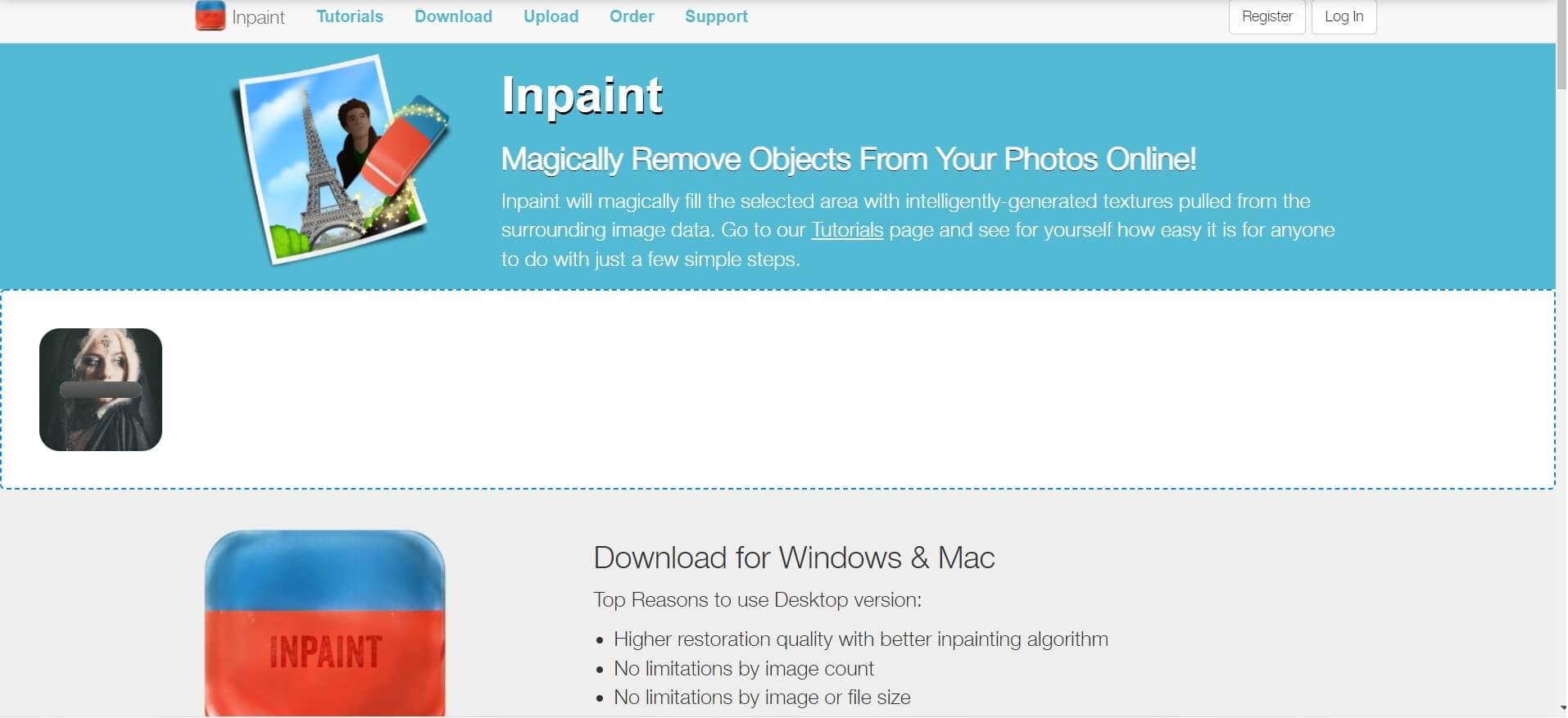 TheInpaint.com исторически связан с программой Inpaint, но в данном обзоре речь именно про онлайн-версию, где весь цикл работы идёт в браузере. Практически это выглядит так: