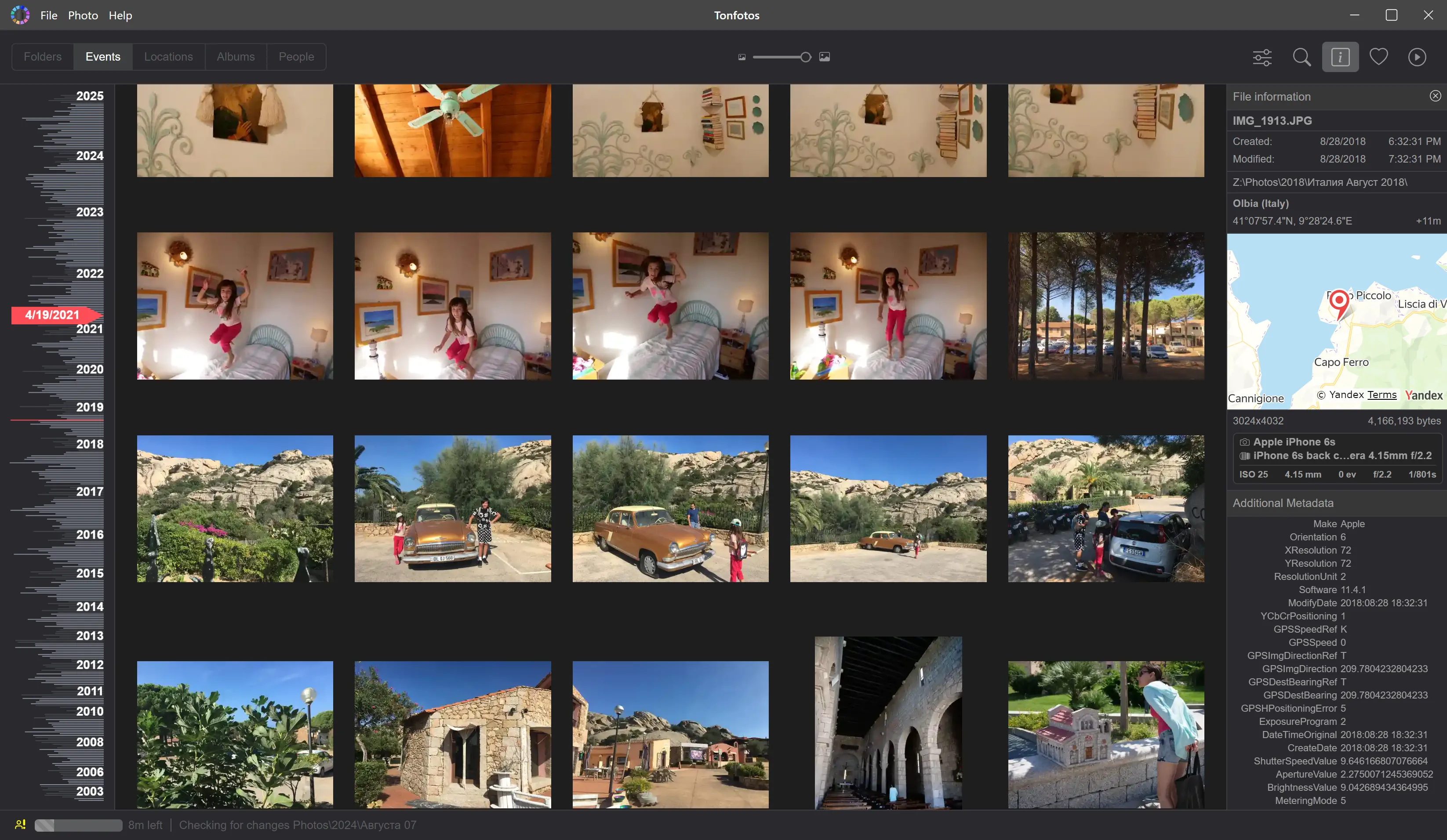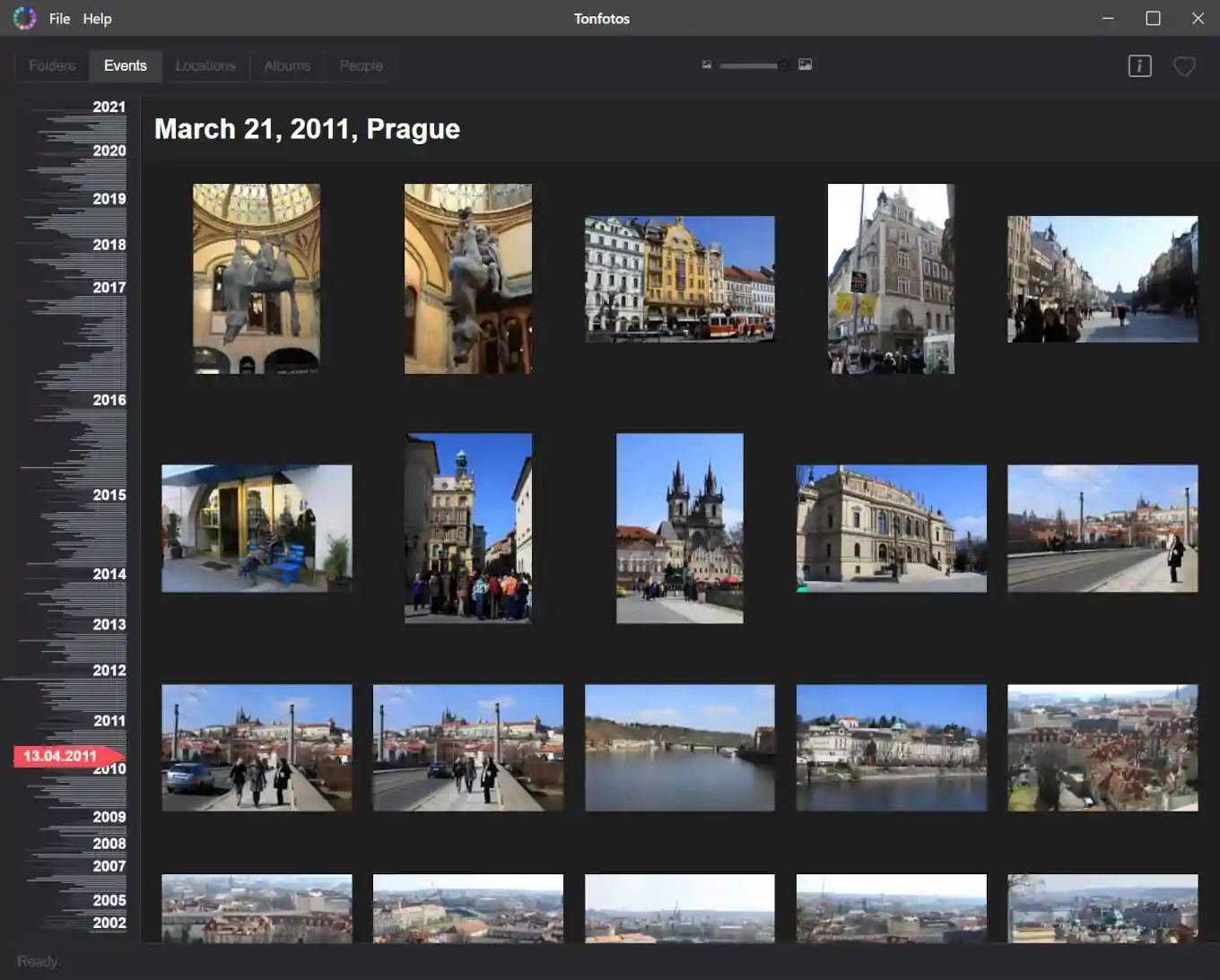 Вкладка Events — один из сильнейших режимов Tonfotos. Программа автоматически группирует снимки в события (по времени и месту), и вы получаете бесконечную ленту событий сверху вниз, где свежие — наверху, старые — ниже.
