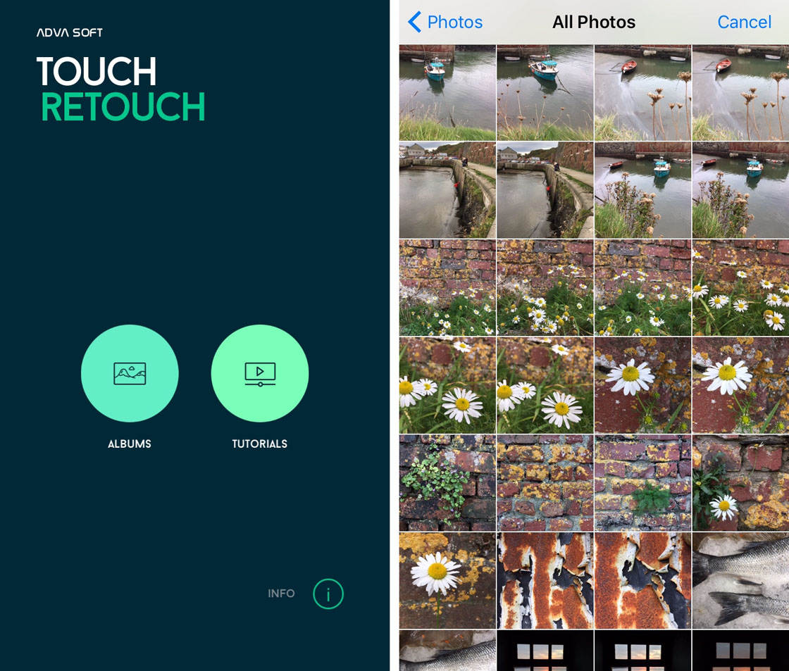 С точки зрения UX TouchRetouch устроен предельно прямолинейно: вы либо открываете фото из галереи, либо заходите в обучающие материалы (Tutorials), чтобы посмотреть встроенные сценарии. На домашнем экране видны крупные кнопки входа в работу.