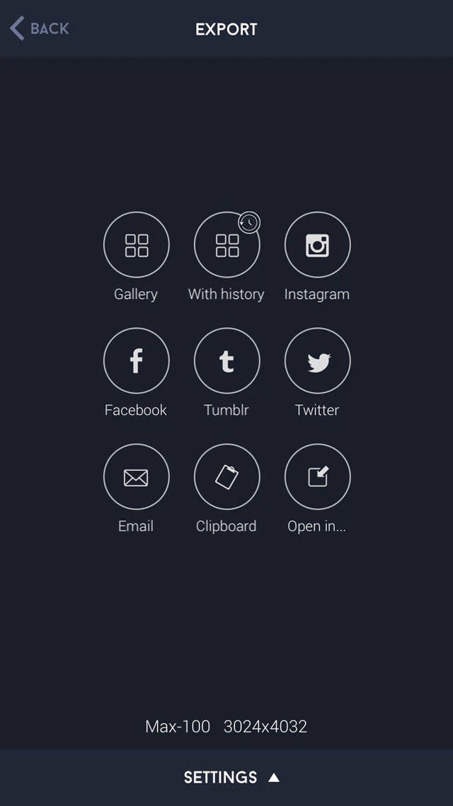 На этом экране вы выбираете, куда отправить готовое изображение. Для сохранения в системную галерею используется вариант Gallery. Если вам важна возможность вернуться к истории правок, предусмотрен вариант With history (он сохраняет результат вместе с историей, чтобы можно было доработать позже). Также доступны варианты отправки в приложения и сервисы (например, через Open in…).