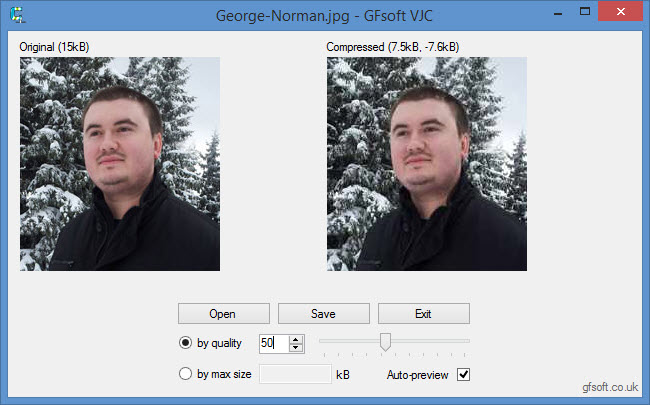 под панелями — блок управления: Open, Save, Exit, выбор режима компрессии и параметры (качество/лимит размера), а также чекбокс Auto-preview.