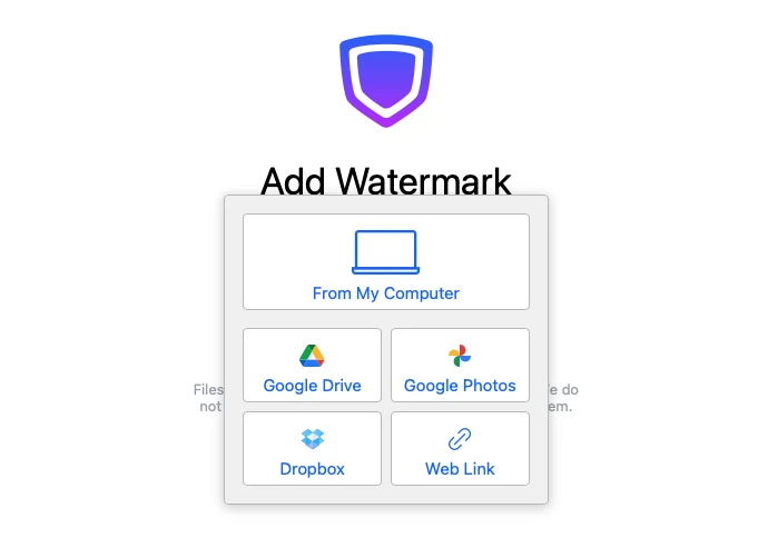 На старте Watermarkly предлагает понятные источники импорта: From My Computer, Google Drive, Google Photos, Dropbox, Web Link — это удобно, если исходники лежат в облаке или на странице товара/портфолио.