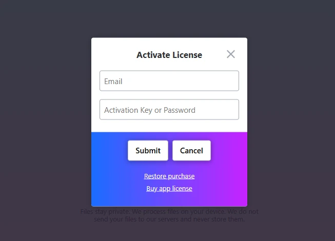 Сама форма активации выглядит как окно Activate License с полями Email и Activation Key or Password, и кнопками Submit / Cancel.