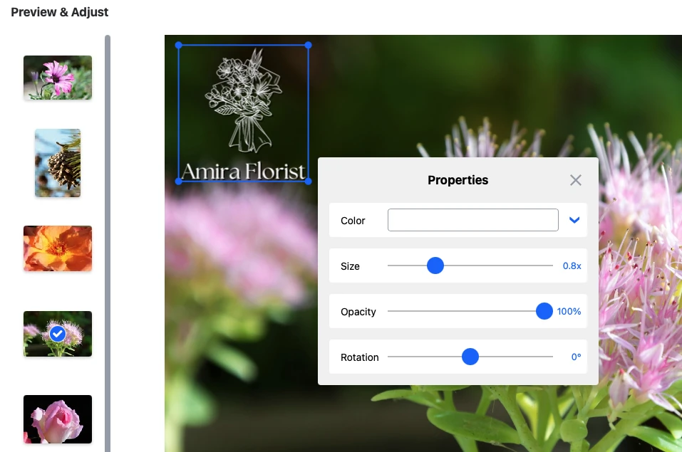 Одна и та же настройка Opacity/Color/Effect может выглядеть отлично на предметке и плохо на портрете или документе. Поэтому Watermarkly подталкивает кPreview & Adjust: там вы быстро проверяете сложные кадры и доводите результат без пересборки проекта.