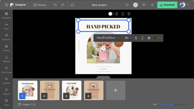 Когда нужен микс шаблон + сток + AI в одном окне: Text to img для генерации иллюстраций, AI Writer для текста, затем Download.