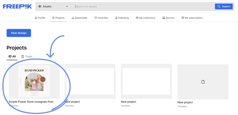 Wepik сохраняет проекты и позволяет возвращаться к ним позже: все работы собираются в Projects. Там вы видите карточки проектов и можете открыть любой, чтобы продолжить редактирование без пересоздания.