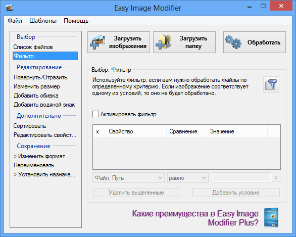 Фильтр — это способ вычистить очередь до нажатия Process, не трогая вручную десятки файлов. В Easy Image Modifier фильтрация построена на свойствах файла и масках.