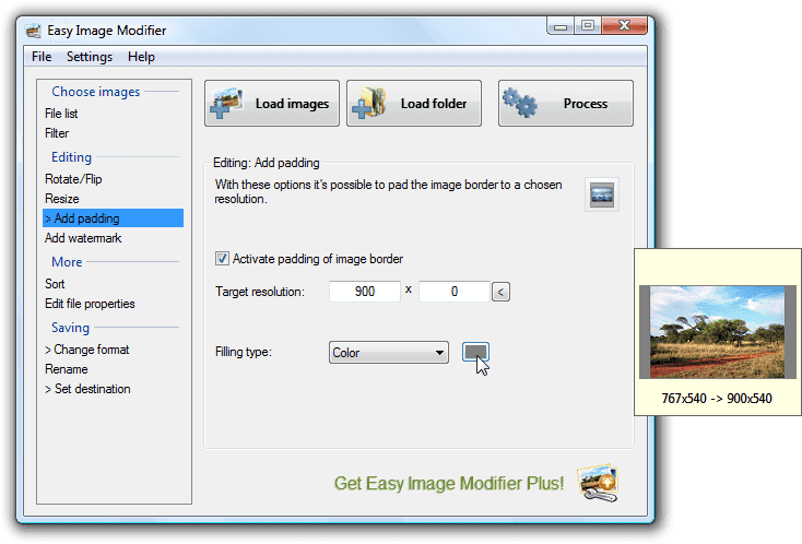 Сильная сторона Easy Image Modifier — именно пакетная обработка изображений: когда нужно подготовить фото для сайта, уменьшить размеры для публикации, проставить текстовый watermark, привести имена к единому шаблону, убрать метаданные (EXIF) перед отправкой или сделать одинаковые поля (padding) под конкретное разрешение — всё это делается пачкой и без лишних экранов.