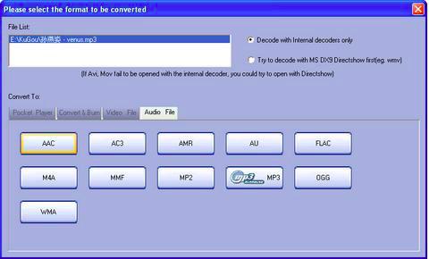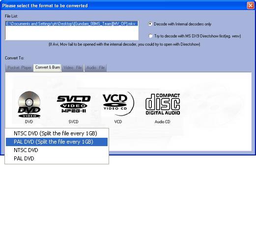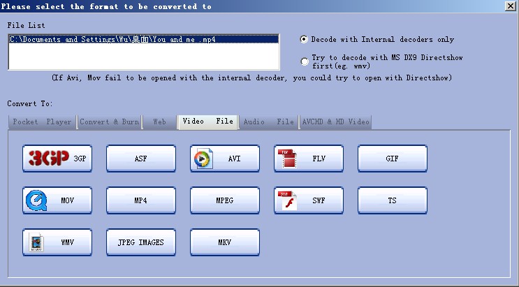 Третий важный элемент — окно выбора целевого формата. После добавления файла появляется окно Please select the format to be converted to, где форматы разложены по вкладкам. Среди них есть Pocket Player, Convert & Burn, Video File, Audio File, AVCHD & HD Video и другие категории. Это один из самых удобных моментов в интерфейсе: вместо сухого выпадающего списка пользователь получает визуально структурированное разделение по задачам.