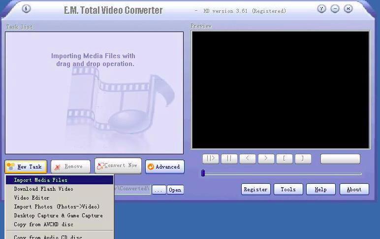 После запуска Total Video Converter пользователь попадает в главное окно с очень характерной компоновкой. Слева находится Task List, справа — область Preview, а в нижней части расположены блоки настроек выходного файла, профиля и деталей профиля. Внизу вынесены служебные кнопки вроде Open, Register, Tools, Help, About, а основная рабочая панель держится на кнопках New Task, Remove и Convert Now.