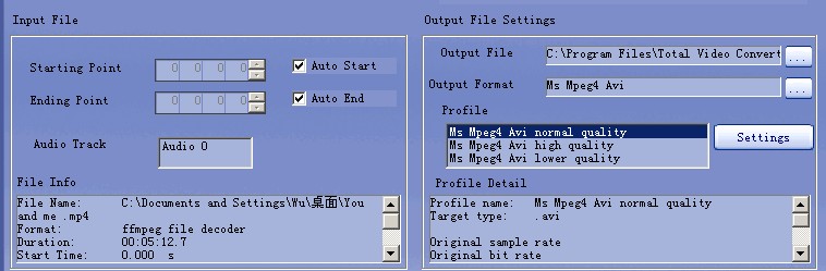 После выбора формата и при необходимости — после правки настроек — пользователь задает выходной путь в блоке Output File, видит итоговый Output Format и выбирает Profile. В профиле можно быстро задать один из типовых уровней качества, а в Profile Detail программа показывает, что именно будет использоваться на выходе. Такой подход делает конвертацию в Total Video Converter прозрачной: не нужно гадать, с каким набором параметров уйдет файл, потому что ключевые детали вынесены прямо в главное окно.