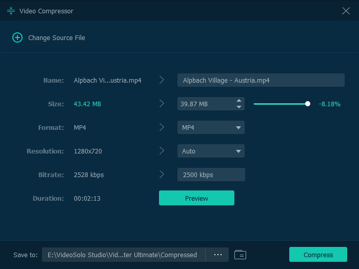 Если смотреть на этот инструмент как на реальный повседневный модуль, его сильная сторона — наглядность. Не нужно мысленно переводить битрейт в будущий размер файла. VideoSolo Video Converter Ultimate сразу показывает параметры и даёт понятный сценарий уменьшения объёма. Для отправки роликов, заливки в мессенджеры, подготовки облегчённой версии архива или просто экономии места это один из самых нужных инструментов программы.
