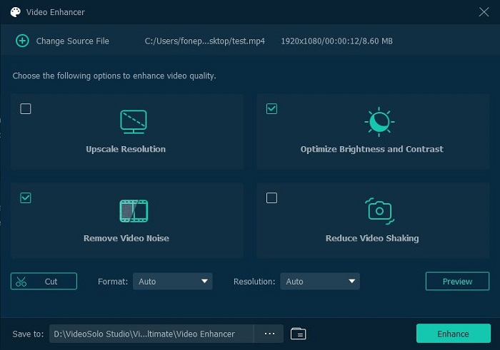 Video Enhancer — это модуль улучшения качества, в котором доступны четыре основные опции: Upscale Resolution, Optimize Brightness and Contrast, Remove Video Noise, Reduce Video Shaking. По сути, VideoSolo Video Converter Ultimate предлагает быстрый пакет подправить картинку без ручной возни и делает это в отдельном упрощённом окне, а не как часть огромной панели настроек.