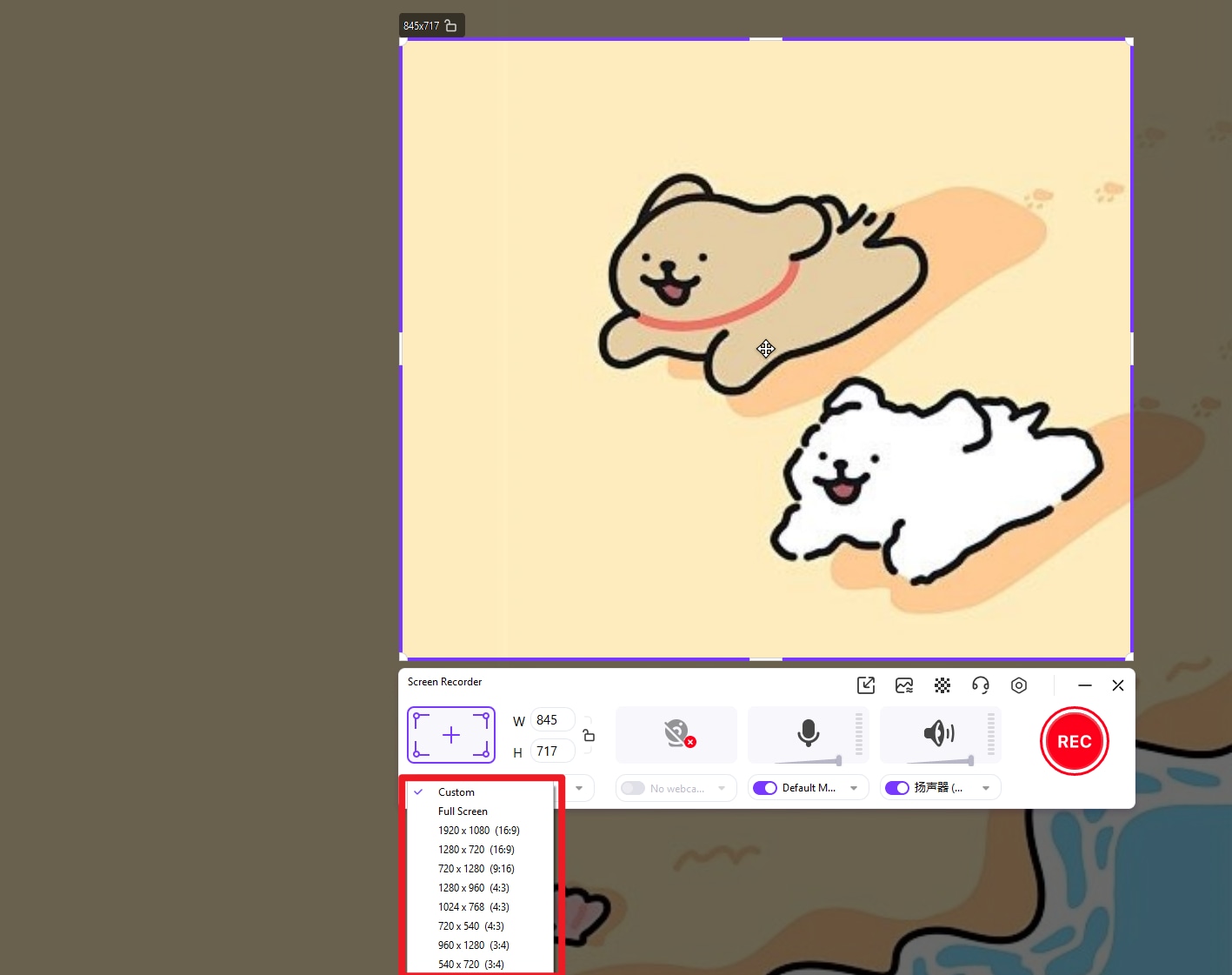 Ниже — окно выбора зоны захвата в Screen Recorder: