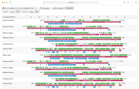 Bitcop особенно хорошо раскрывается там, где руководителю мало знать только сколько часов человек был за компьютером. Здесь важнее другое: когда сотрудник начал день, когда реально включился в работу, сколько времени ушло на профильные программы, где были простои, что происходило в течение дня по временной шкале, какие задачи трекались, были ли звонки, встречи и некомпьютерная активность. За счет этого Bitcop полезен не только собственнику бизнеса, но и руководителю отдела, HR, службе безопасности и операционному менеджеру.