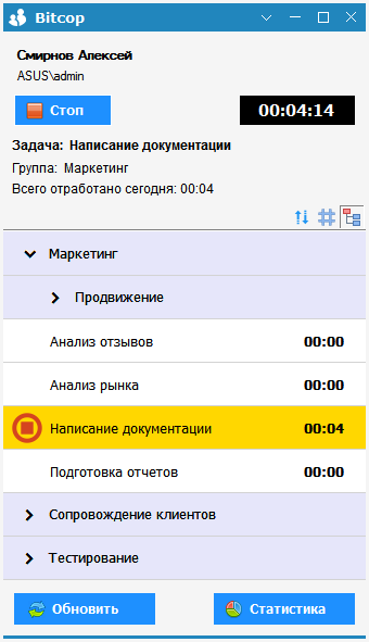 С точки зрения управления задачами Bitcop хорош там, где руководителю нужно ответить на два вопроса: сколько времени ушло на задачу и чем сотрудник был занят в этот интервал. В сочетании с программами, сайтами, структурой дня и скриншотами получается довольно полная картина. Это особенно удобно в подразделениях, где нужно сверять оценку трудозатрат с фактом и понимать реальную себестоимость операций.