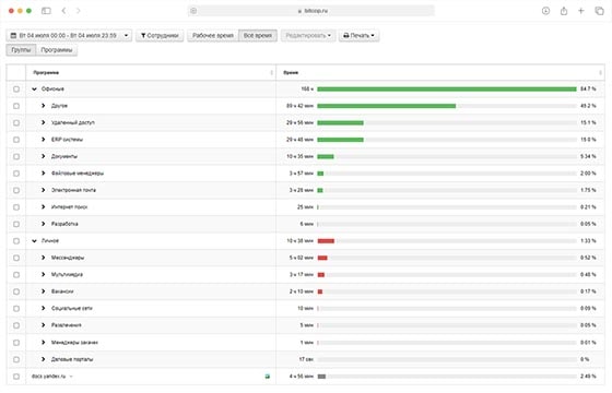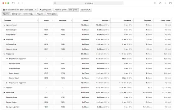 В рабочем процессе это дает понятный управленческий эффект. Руководитель видит не просто количество часов, а структуру трудозатрат: сколько времени человек действительно работал, сколько отсутствовал за ПК, насколько стабильно укладывается в график, есть ли систематические опоздания и где появляются переработки. В отделах продаж это помогает оценить дисциплину, в back office — загрузку, в сервисе — стабильность смен, в бухгалтерии — реальную плотность дня в отчетные периоды.