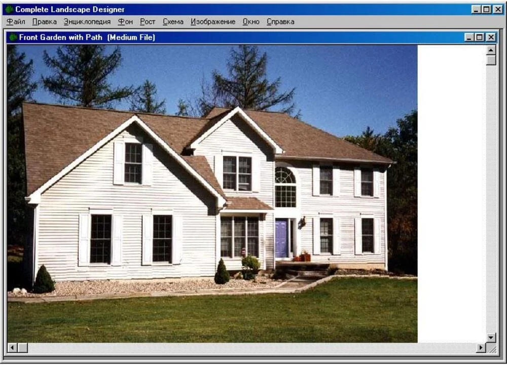 Лучший вариант — взять фотографию реального участка или фасада, где хорошо читаются плоскости дома, входная дорожка, существующие посадки и свободные зоны. Complete Landscape Designer изначально заточен под работу с такими сценами. Если реального снимка нет, можно открыть шаблонный фон через Background → Sample Background и начать с него. Для обучения особенно показателен Front Garden with Path.