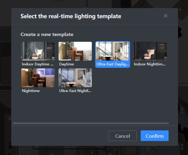 Вход в real-time rendering устроен двумя способами. Первый — открыть render toolbar и выбрать Real-time Rendering. Второй — зайти в Render и выбрать Add to Real-time Rendering в секции lights. После этого выбирается шаблон освещения. Coohom предлагает шесть шаблонов: Daytime, Nighttime, Indoor Daytime 3.1, Indoor Nighttime 3.1, Ultra-Fast Daylight 3.1, Ultra-Fast Nightlight 3.1. Это не просто косметические пресеты, а быстрый старт для разного сценария подачи.