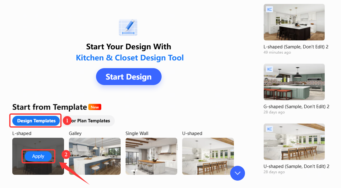 Вход в модуль организован очень прямо. В рабочем пространстве создается New Kitchen & Closet Project, затем открывается Start Design, где можно выбрать Design Templates и нажать Apply. После этого пользователь попадает в режим выбора кухни или шкафа и начинает собирать сцену уже в профильном интерфейсе. Самое важное здесь — Coohom не вынуждает строить кухню из абстрактных коробок; он сразу переводит задачу на язык реальных категорий: Base Cabinet, Wall Cabinet, Tall Cabinet, panels, drawers, hardware и так далее.
